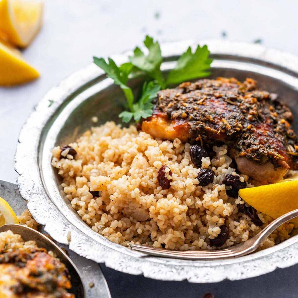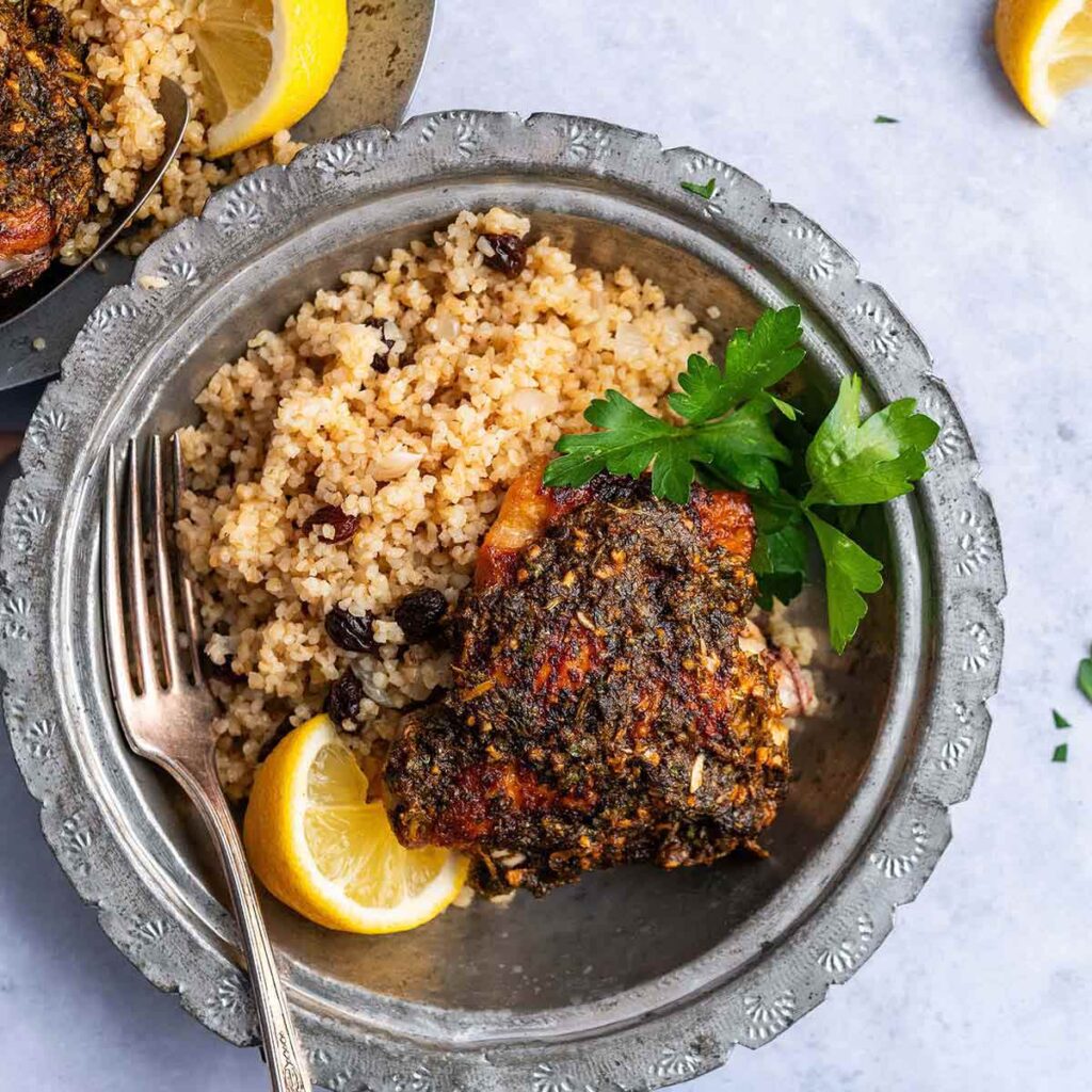 This chermoula chicken recipe yields tender, juicy meat with crispy skin and tons of flavor thanks to a fresh zesty, spicy North African herb sauce. This restaurant-quality meal whips up in less than an hour and pairs well with couscous, rice, or an easy bulgur wheat pilaf.